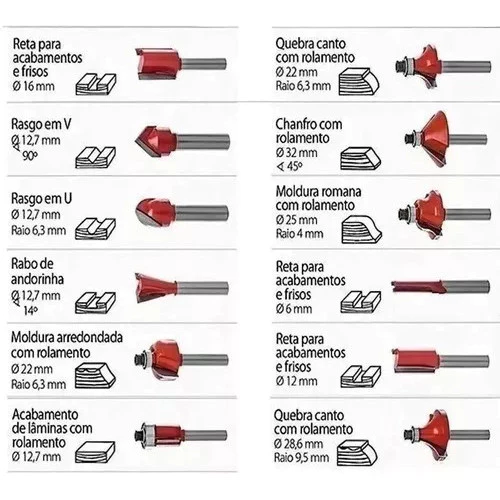 O modelo Freza 12 peças tupia madeira profisional compattivel com tupia makita, Dewalt, Bosch de 6mm, é um dos mais procurados devido à sua qualidade e durabilidade. As fresas possuem haste de 6mm 1/4″, o que garante um encaixe perfeito e seguro.
