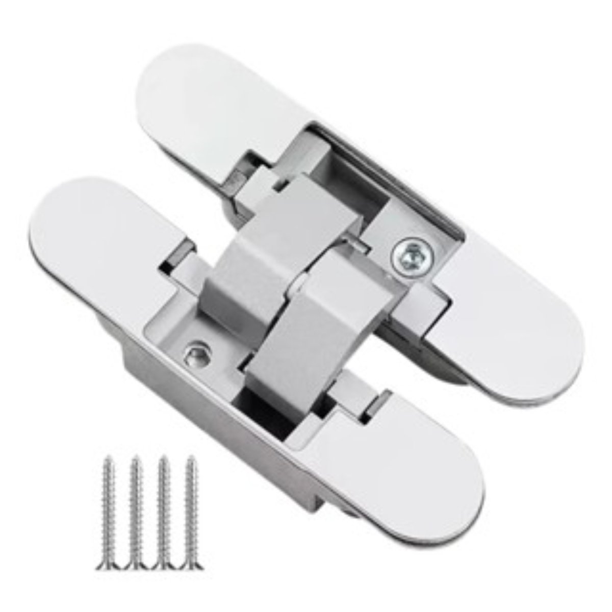 Dobradica Invisivel 3D 110mm para Móveis com Parafusos escovado oferece alta resistência e é projetada para instalação embutida. Ideal para portas de madeira e alumínio, proporciona uma articulação suave e discreta entre os eixos.