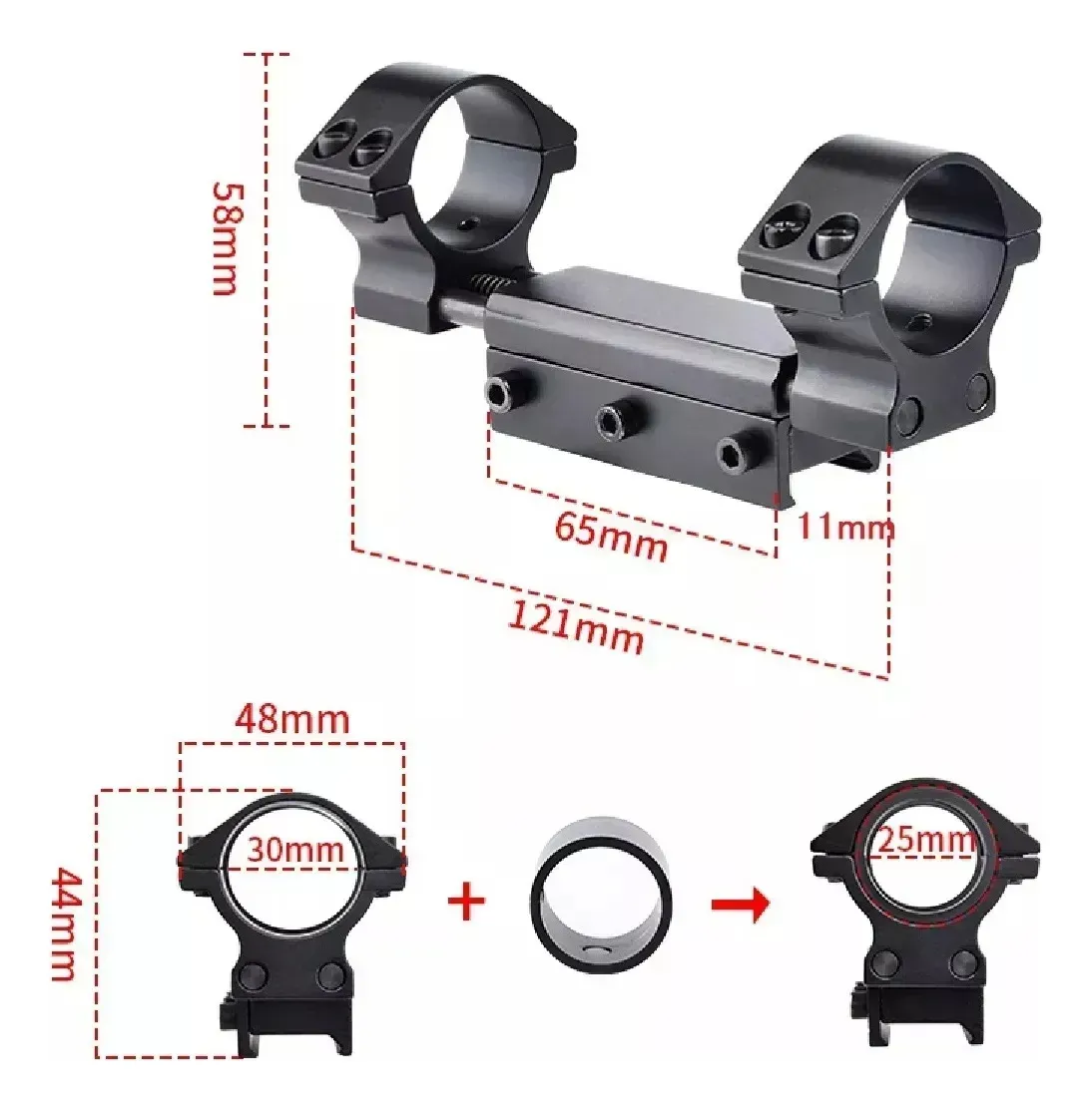• Compatibilidade: Trilho 11mm + lunetas 25.4mm / 30mm