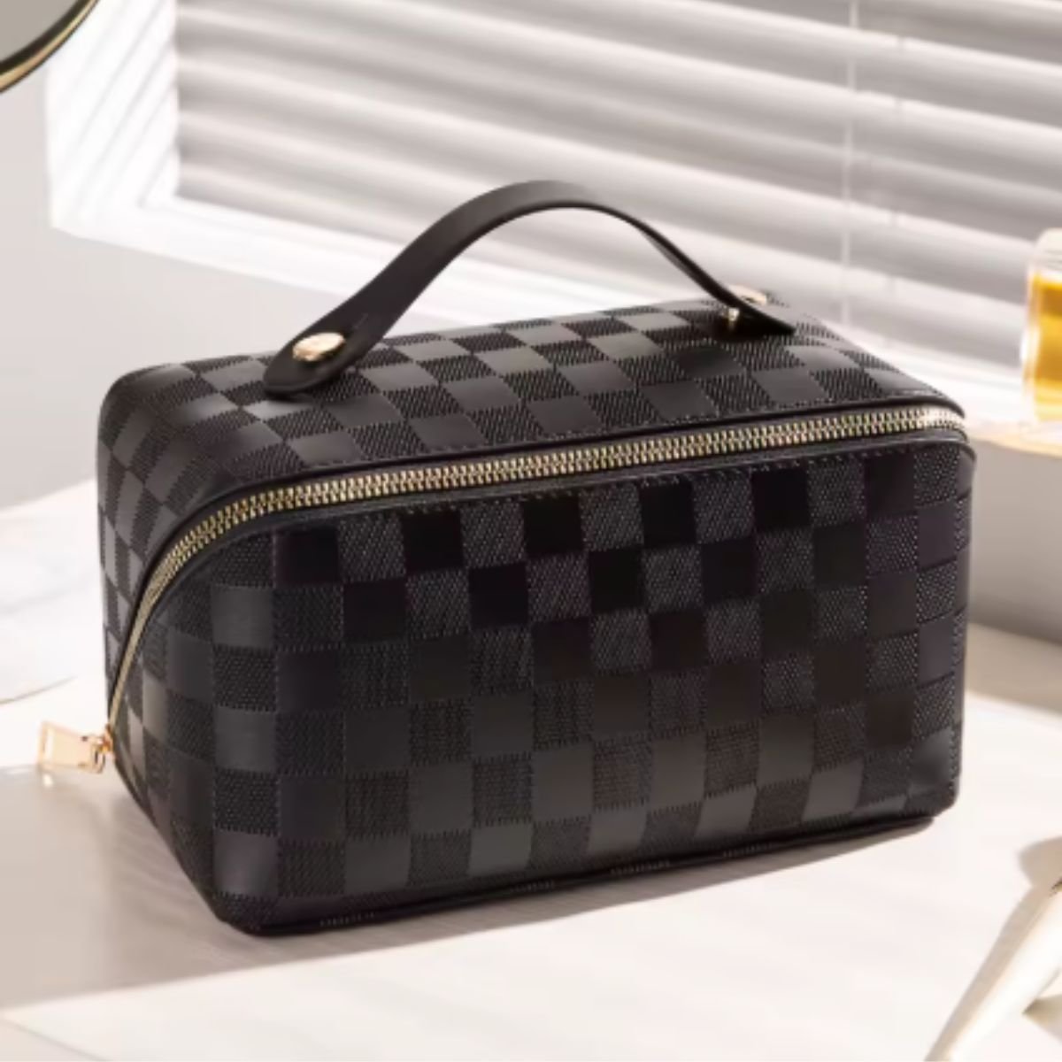 Produzida em PU macio e resistente, possui superfície impermeável, protegendo maquiagens e cosméticos contra umidade, vazamentos e sujeiras. Seu armazenamento multifuncional permite guardar não apenas maquiagem, mas também joias, acessórios eletrônicos, câmeras, óleos essenciais, roupas íntimas, lâminas de barbear, óculos e objetos de valor.