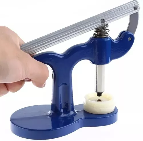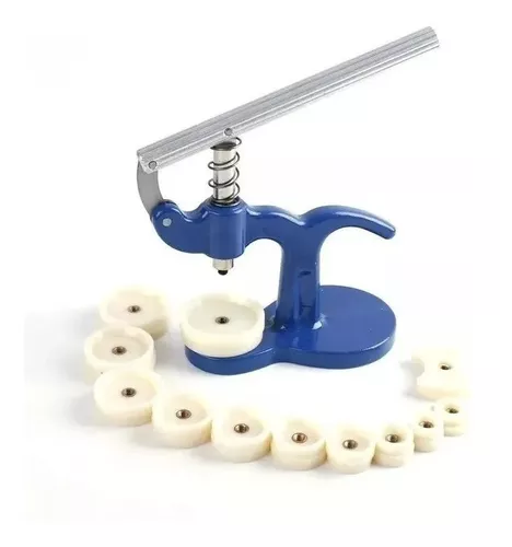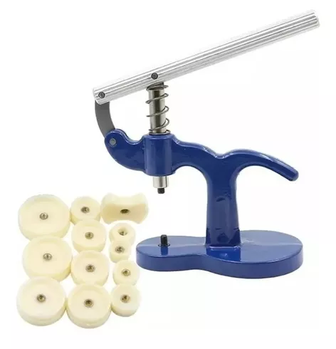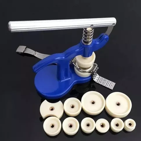 PRENSA PARA FECHAR E COLOCAR VIDRO EM RELÓGIO SOB PRESSÃO, DE FORMA SEGURA SEM DANIFICAR O RELÓGIO, CONFECCIONADA EM FERRO FUNDIDO E COMPOSTA DE 12 MATRIZES DE NYLON COM AS SEGUINTES MEDIDAS : 15-17 MM , 18-20 MM , 21-23 MM , 24-26 MM , 28-30 MM , 31-32 MM , 33-34 MM , 34-44 MM , 36-38 MM , 40-42 MM , 43-45 MM , 48-50 MM .