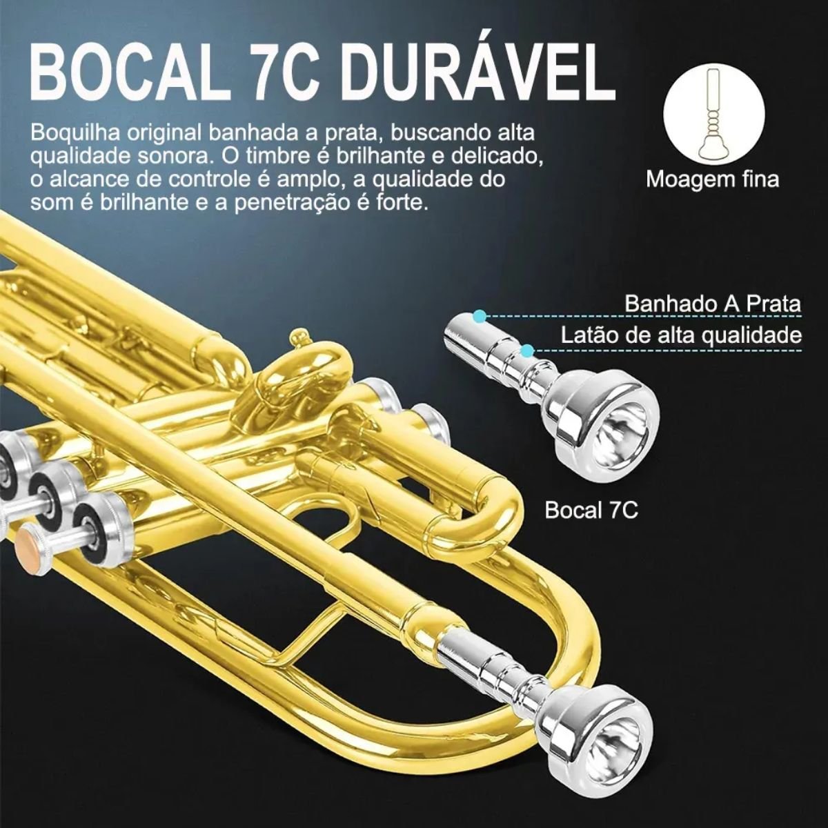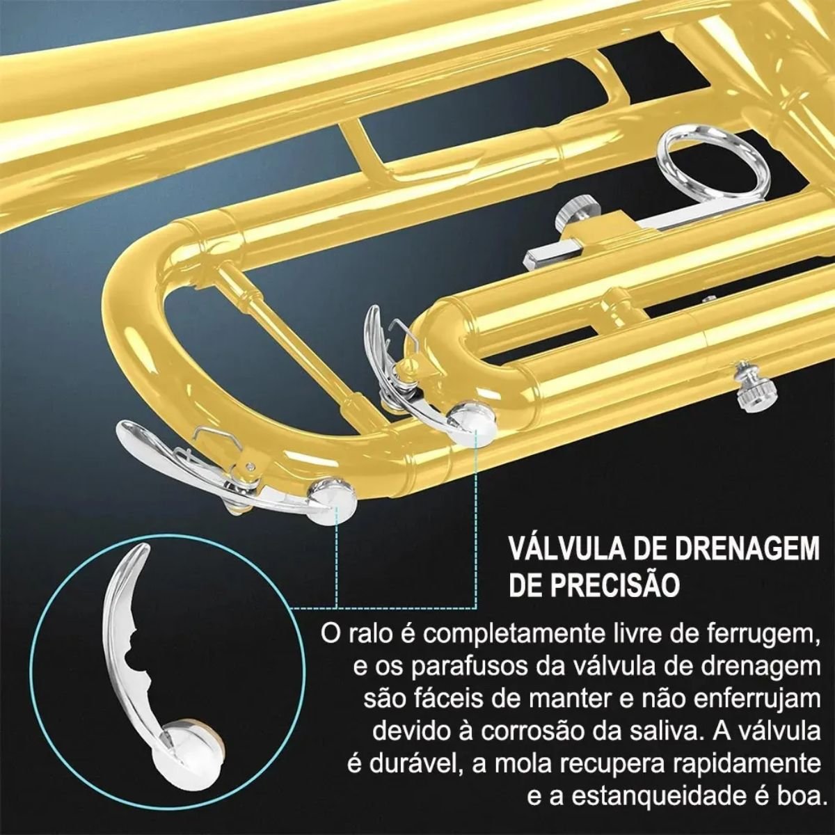 Trompete fabricado em latão de alta qualidade, com acabamento dourado brilhante e alto poder de reflexão. Um instrumento elegante, resistente e durável. Acompanha estojo rÃgido, ideal para transporte seguro e proteção.